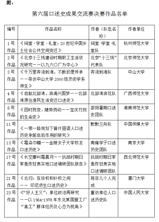 “全国大学生口述史成果交流赛”由中华口述历史研究会主办,中山大学历史系承办,目前已成功举办六届,成为口述史领域的重要赛事。第六届大赛的主题是“时代巨澜下的生命史追忆”,来自全国各大高校27支队伍参加了初赛,经过激烈的角逐后,最终有10支队伍入围决赛。
