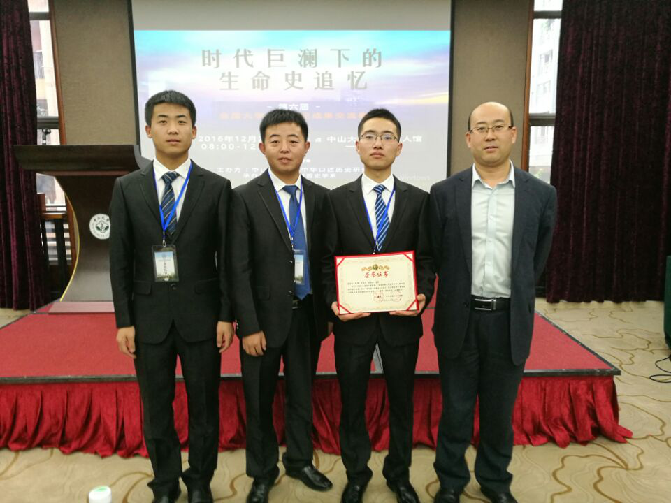 2016年12月25日,“第六届全国大学生口述史成果交流赛”决赛在中山大学学人堂举办。我院提交的作品《长空雁叫霜晨月——抗战时期日军轰炸甘肃口述实践调研》荣获三等奖。该作品是在尚季芳老师的指导下,由研究生岳丽、李江龙,本科生靳帅、罗安兵、张宝同、李嘉燕共同完成。中国社科院近代史所研究员、《近代史资料》主编庄建平教授,中国社科院近代史所研究员、中华口述历史研究会秘书长左玉河教授、中山大学历史系主任吴义雄教授、中山大学历史系谷小水副教授、华南师大黄珍德副教授担任评委。