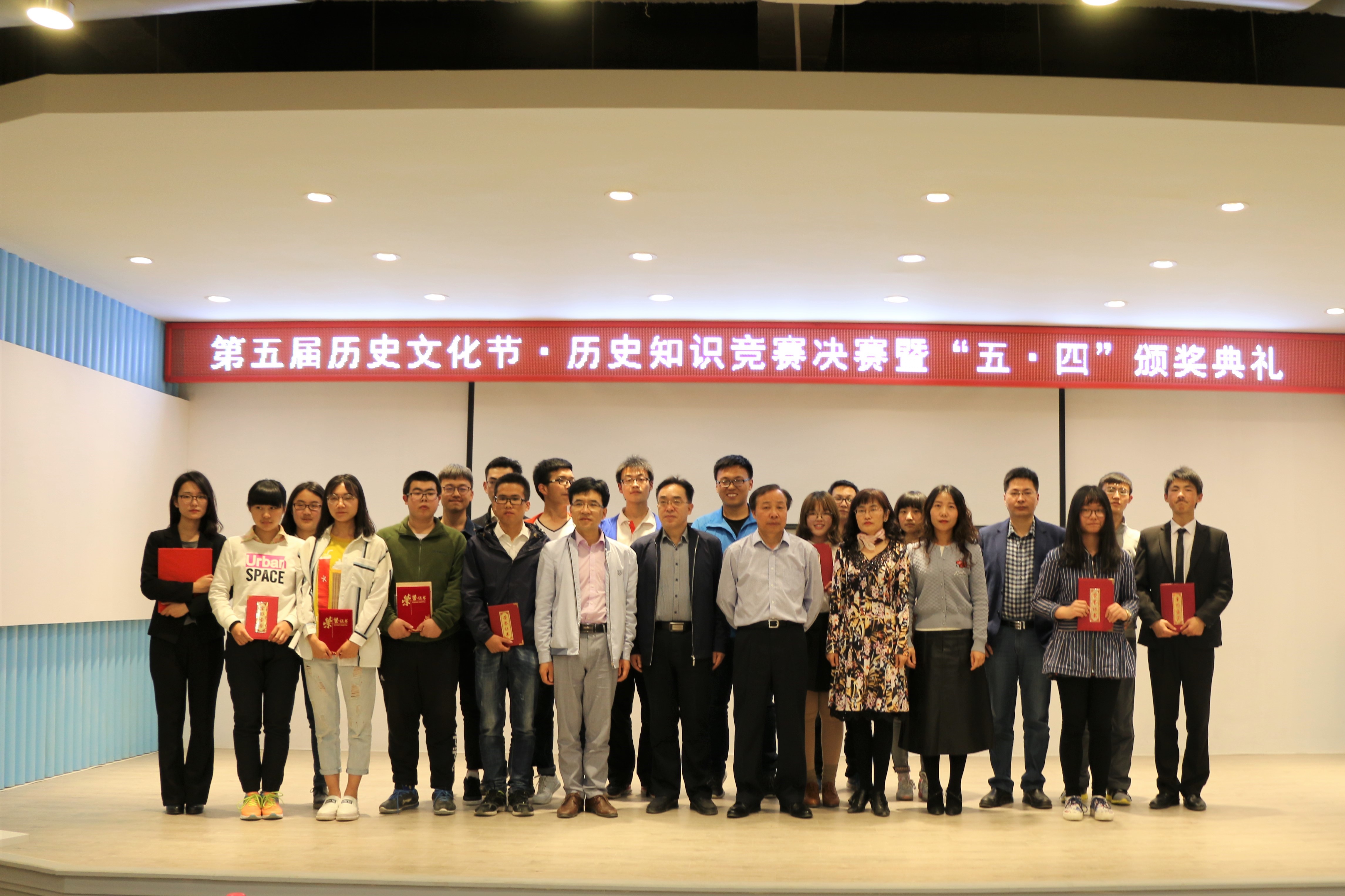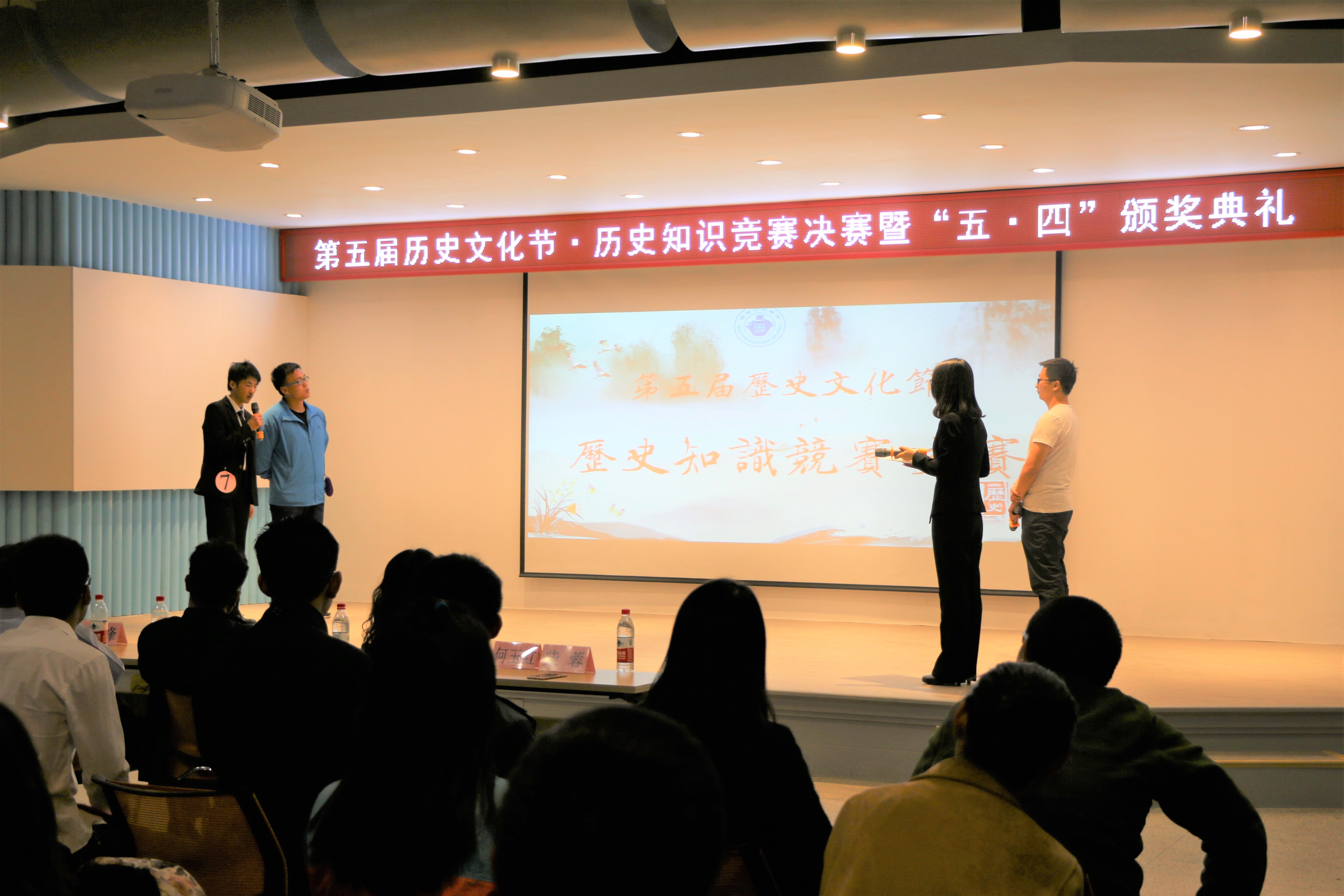 5月8日晚我院在大学生发展中心举行了第五届“历史知识竞赛”决赛暨“五•四”表彰大会。学院党委书记李迎新老师、院长杨鹏飞老师、副院长何玉红老师,副书记柴蓉老师以及我院郑峰老师、吕海军老师、李晓英老师等一百余名师生参加了当晚的活动。