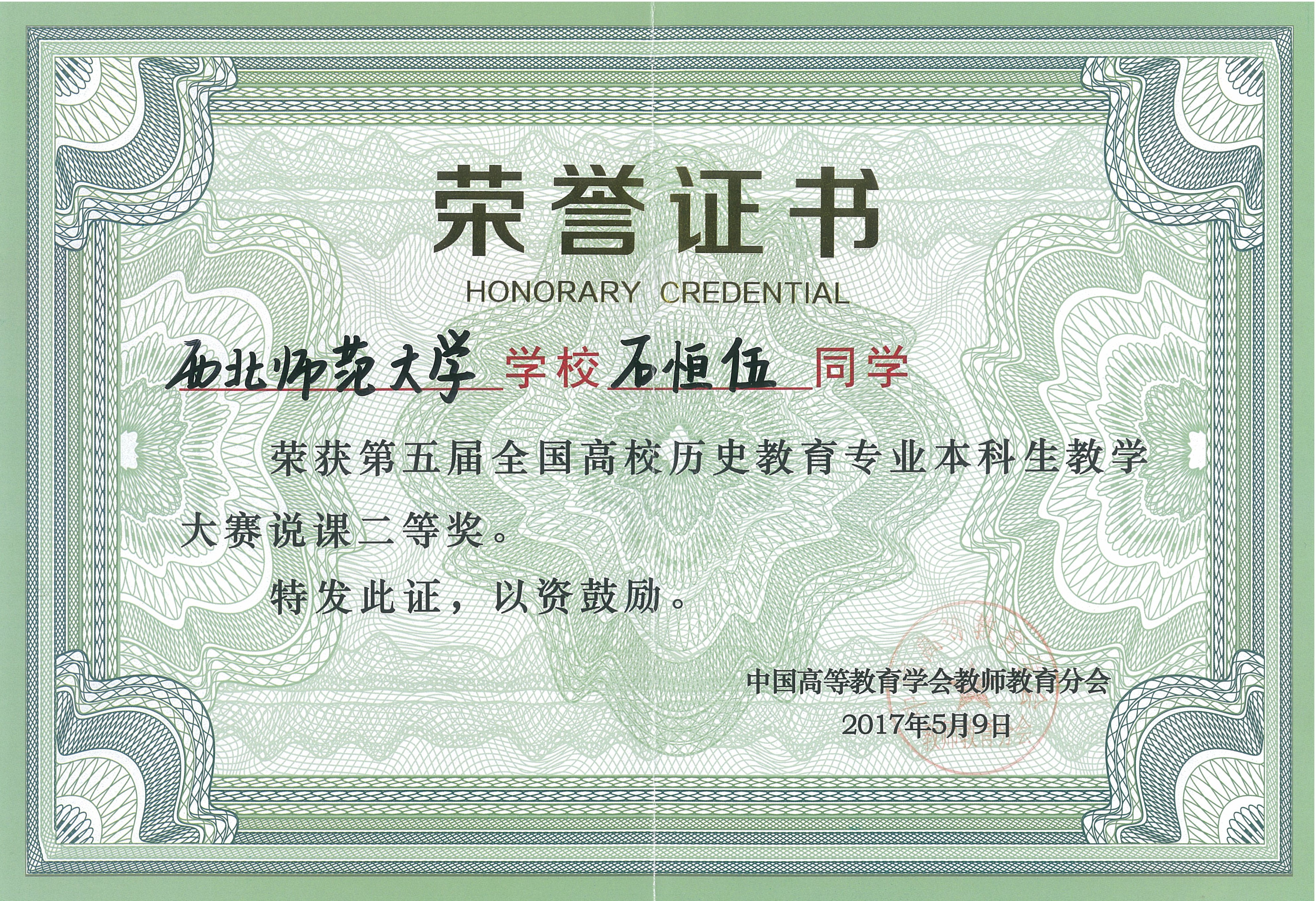 石恒伍,男,汉族,1994年7月生,甘肃天水人。4188云顶集团2013级历史学1班学生。大学期间,通过全国计算机二级等级考试、全国大学生英语四级考试、普通话等级考试等。2014年荣获4188云顶集团第三届历史文化节知识竞赛一等奖,2015年荣获4188云顶集团第十三届从师从(业)技能大赛说课比赛一等奖,2016年荣获西北师范大学“从师从(业)技能奖”,2016年秋季赴甘肃省陇南市徽县二中实习,并被评为西北师范大学第五十七届教育实习优秀学生,2017年5月赴聊城大学参加第五届全国高等学校历史教育专业本科生教学技能比赛说课二等奖。现已被阿克苏地区一中录取为高中历史教师。