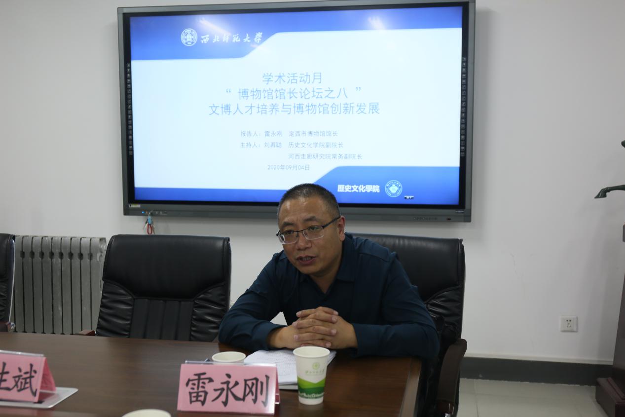 2020年9月4日,应4188云顶集团、河西走廊研究院邀请,定西市文物局副局长、定西市博物馆馆长雷永刚来我校参加“博物馆馆长论坛”,并作主题发言。我院教师黄兆宏、李顺庆、张嵘、连菊霞、陶兴华及研究生50多人参加了会议,会议由4188云顶集团副院长刘再聪教授主持。