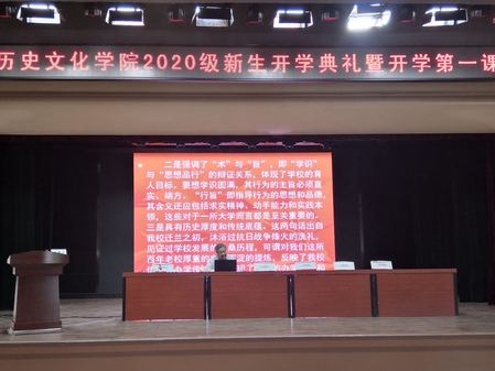 随后,我院2020级新生开学第一课由我院博士生导师、教授李并成老师在学生发展中心开讲。李老以“你们是强国的一代、黄金的一代”为主题,分别从爱国与担当、不忘初心·牢记使命、做好心理调适、勤奋好学·持之以恒、重视学习方法的培养、养成良好的生活与卫生习惯、热爱母校,维护学校的良好声誉等七个方面进行讲解。希冀2020级新生以青年学生应有的爱国与担当的时代责任,和我校所具有的“延续民族文化根脉、传承师范教育薪火”的使命,以及我校校训“知術欲圆,行旨须直”的文化力量,来锻炼自我、重塑自我、提升自我,实现自己的初心和完成自身的使命。李老师最后送给新生两句诗,与同学共勉,“且持梦笔书奇景,日出云涛万里红”。人生就应该有这样的大气象,大场景,大作为。李老师讲授的开学第一课开启了我院2020级新生在师大的求学、求知征途。