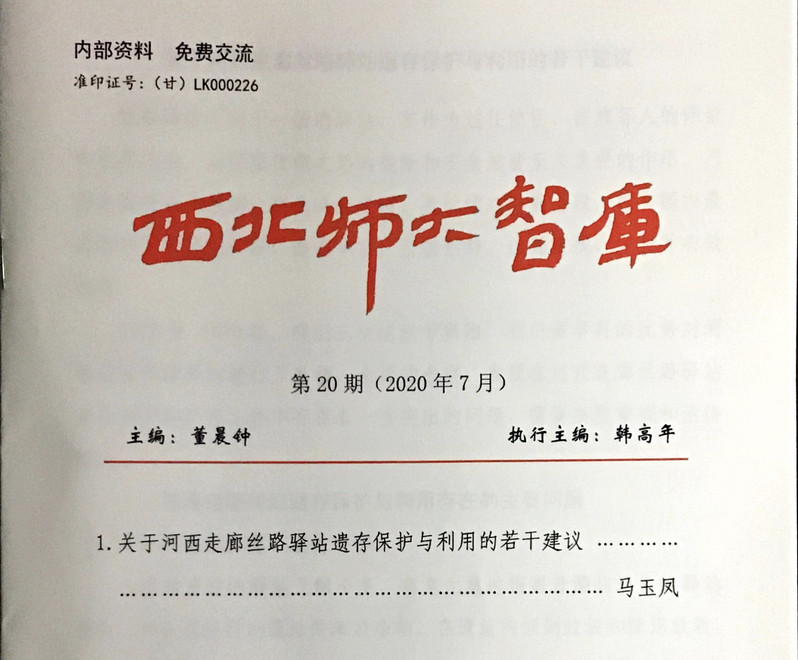 近日,由我院马玉凤老师撰写的《关于河西走廊丝路驿站遗存保护与利用的若干建议》智库成果在《西北师大智库》第20期(2020年7月)刊登。