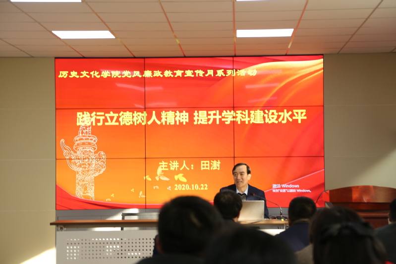 2020年10月22日,我院举办党风廉政教育宣传月系列活动,邀请西北师范大学党委常委、副校长田澍同志作“践行立德树人精神 提升学科建设水平”主题报告。全院教职工现场听取了报告。
