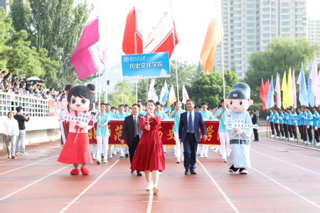 开幕式上,历院方阵表演的同学们昂首挺胸,大步向前,充分体现出身为历院学子的自信与激情;在学生们的身后,是凌云壮志的历院老师们,他们意气风发,精神抖擞。师生队伍在旗手带领下入场,同学们手持向日葵,花海围绕着“庆祝中国共产党建党100周年”展牌,以此表达对建党百年的真挚祝福。