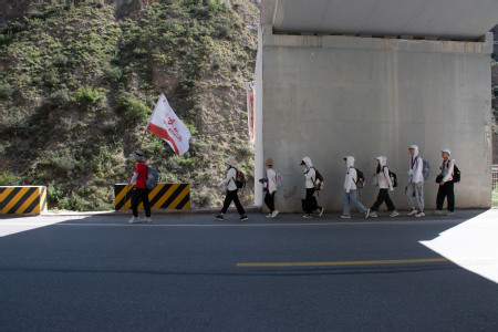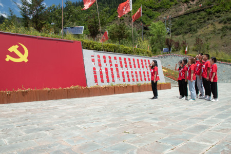 2021年7月31日,实践队员从甘肃省甘南州迭部县代古寺出发,徒步前往腊子口战役遗址,18公里的路途,实践队员在烈日骄阳之下践行“重走长征路”,路途虽远,但激情高昂,路漫漫其修远兮,在一步步向前的过程中,实践队员深刻感悟了革命先辈艰苦奋斗、英勇顽强,一往无前的长征精神。在长征路上,红军战士们忍饥挨饿,艰难跋涉,战胜了难以想象的艰难困苦。实践队员一面走,一面高唱红色歌曲《映山红》,歌声嘹亮,在山谷间响彻不绝。沿途红旗飘飘,从远处望去,就如同映山红开遍山间。队员们步伐一致,信念坚定毫不退缩。到达腊子口战役遗址后,队员们参观遗址,看着石壁上遗存当年战斗留下来的弹孔,仿佛如火如荼的战役就在眼前上演。如今天堑已变通途,当年硝烟弥漫的战场已被绿水青山掩映。腊子口已然成为追忆往事,致敬英烈,感悟长征艰辛的圣地。