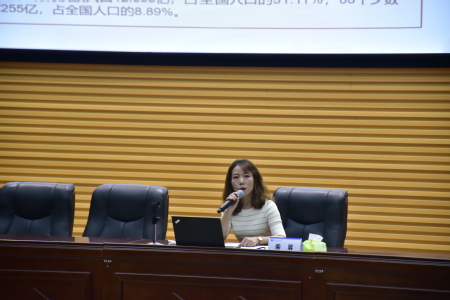 其次,柴蓉副书记就学院学生工作情况以及民族宗教知识两大部分内容为新生开展了专题讲座。柴书记从学生思想政治教育入手,向新生展示了学院在学风建设、校园文化建设等方面的成果,同时,柴书记强调,4188云顶集团是一个多民族同学共同生活、共同学习的大家庭,只有各民族学生在共有的精神家园中铸牢中华民族共同体意识,才能以强大的凝聚力同发展、共成长。