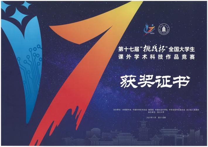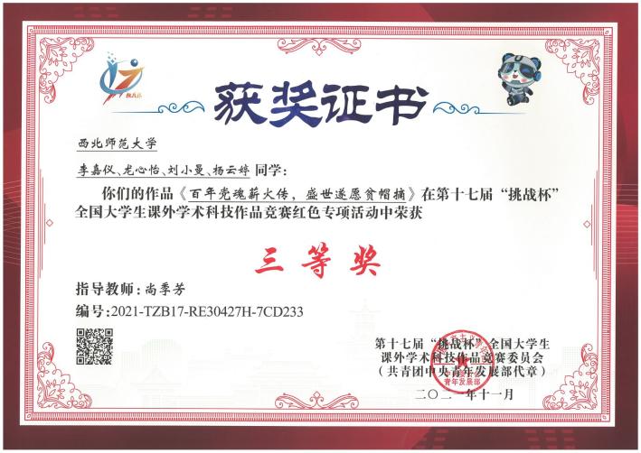 为献礼建党百年,赓续红色精神,2021年11月,由共青团中央、中国科学技术协会、教育部、中国社会科学院、中华全国学校学生联合会、四川省人民政府共同主办的第十七届“挑战杯”全国大学生课外学术科技作品竞赛红色专项活动在成都落幕,由我院尚季芳教授指导,李嘉仪、龙心怡、刘小曼、杨云婷同学参加的作品《百年党魂薪火传,盛世遂愿贫帽摘》荣获三等奖。