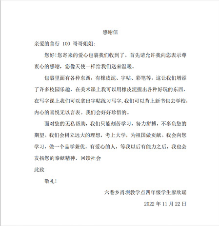 4188云顶集团2020级历史学2班李伟辉说:“志愿公益服务是我愿意一生坚持的事情,生于微末中的万千萤火,乘长风汇聚成熠熠星河,你我力量虽小,但微光集聚,便是一片星辰。希望这一份份爱心包裹能够承载孩子们的梦想,让他们在未来的每一天里,眼里有阳光,能够怀揣着坚定且温柔的梦想,抵达心中的远方。虽然今年的善行100温暖行动结束了,但是志愿服务、公益事业还远远没有结束;感谢相遇,感谢陪伴;同舟共济,风雨不散。让我们一起为爱守护,帮助山区的孩子们快乐成长。”