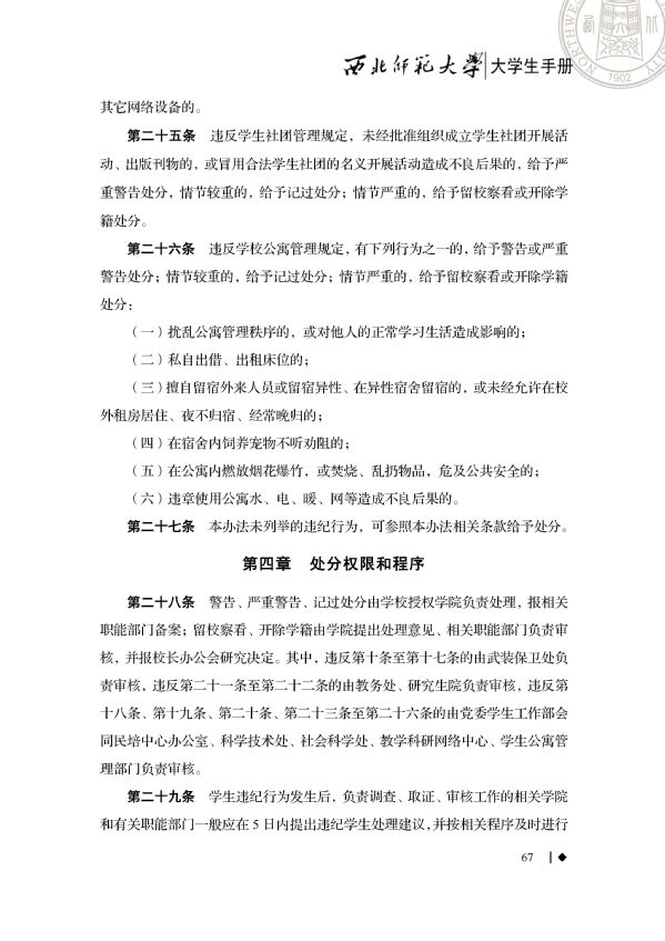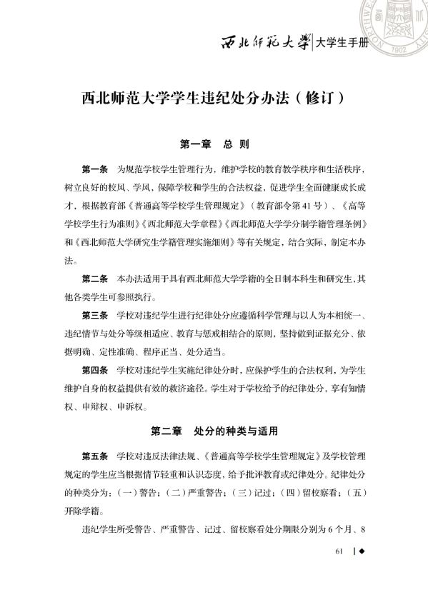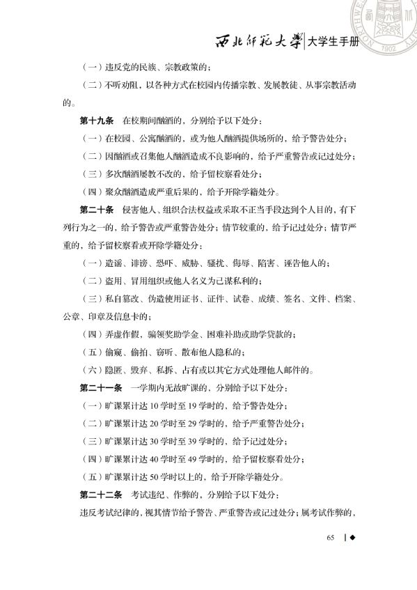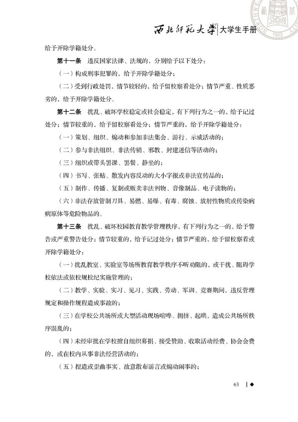 今天我们要学习的是《大学生手册》中西北师范大学学生违纪处分办法重点内容。