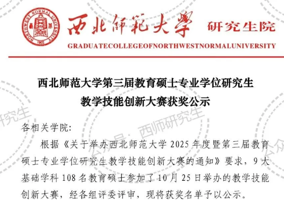10月25日,西北师范大学第三届教育硕士专业学位研究生教学技能创新大赛圆满落幕。我院选派的9名学科教学(历史)专业研究生凭借扎实的专业功底、创新的教学设计和出色的现场表现,在比赛中脱颖而出。经过紧张激烈的角逐和严格的专家评审,最终: