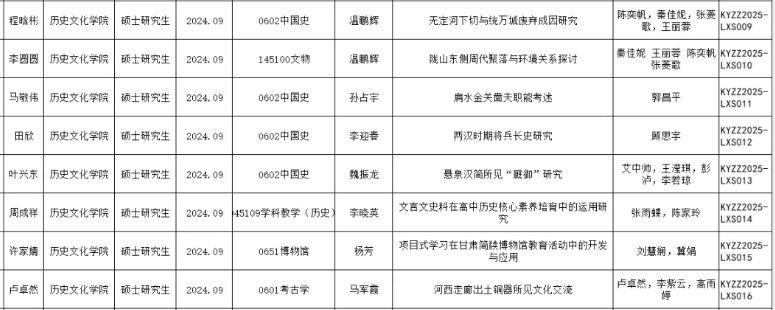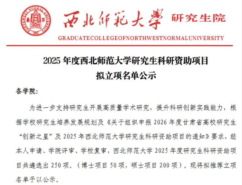 9月25日,研究生院公布《2025年度西北师范大学研究生科研资助项目拟立项名单》,我院研究生科研立项工作再传捷报,共成功获批项目10项。其中,博士研究生项目2项,硕士研究生项目8项,标志着学院在培养高层次研究人才和激发学生科研创新能力方面取得了新的显著进展。