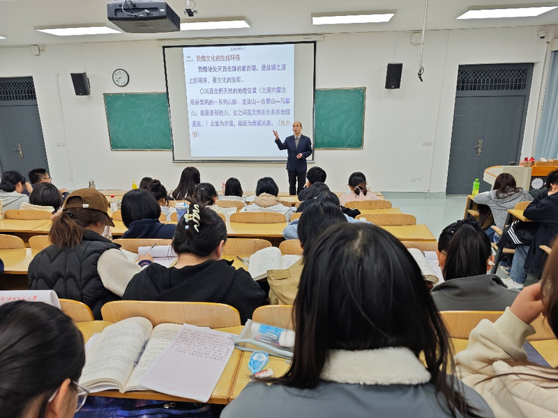 秦丙坤老师从敦煌作为古丝绸之路璀璨明珠的历史地位切入,系统阐述了敦煌学作为国际显学的内涵与价值。他结合自己多年的研究成果,通过丰富的案例,生动讲解了莫高窟艺术与藏经洞文献的珍贵价值,引领同学们深刻感受了中华文明包容创新的精神特质与敦煌这座世界艺术宝库的深厚底蕴。