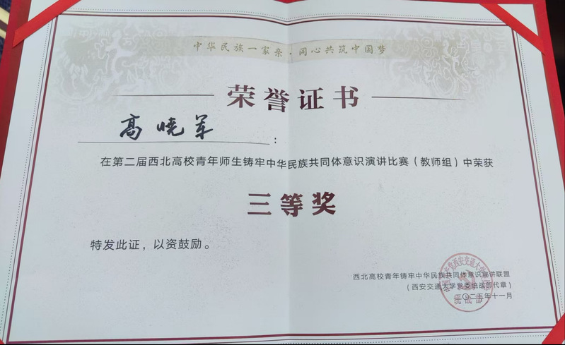 11月14日,由西北高校青年铸牢中华民族共同体意识宣讲联盟主办的“西北高校青年铸牢中华民族共同体意识宣讲联盟第二次会员大会暨西北高校青年师生主题演讲比赛”在兰州大学举行。我院青年教师高晓军以《“华夏”——中国人最早追求的身份认同》为题进行演讲,最终获得教师组三等奖。
