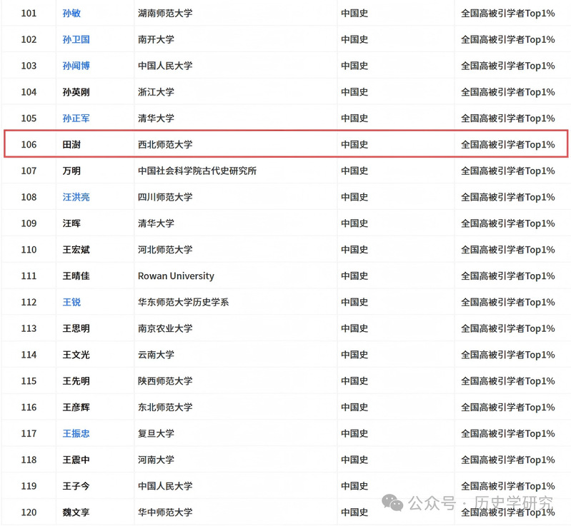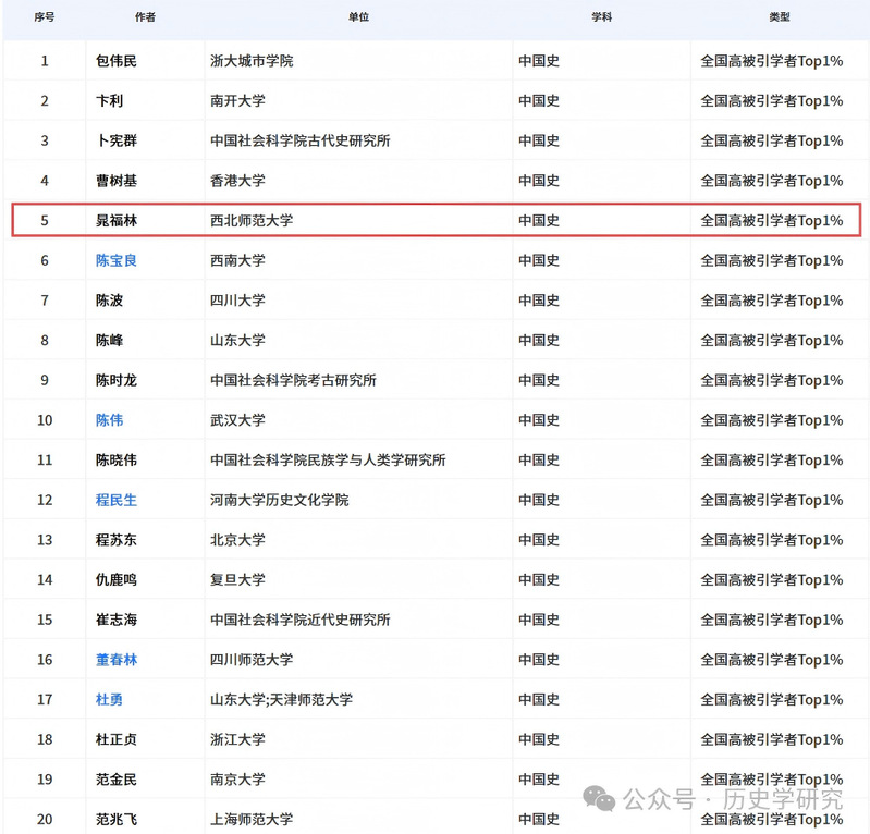 近日,中国知网发布了“2025年全国高被引学者名单”,共统计约12万人,其中Top1%学者约3万人,Top5%学者约9万人。我院晁福林教授、田澍教授入选“中国史2025年全国高被引学者Top1%”。名单的发布旨在表彰各学科领域产生重要影响力的学者,鼓励更多论文写在祖国大地上,也为青年学者提供价值认可和职业发展的重要参照,从而共同促进学术繁荣发展。